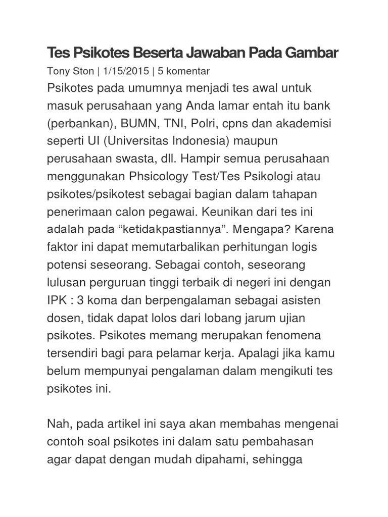 Dapatkan contoh soal psikotest lengkap kumpulan soal soal psikotes yang bisa membantu untuk persiapan test masuk kerja ataupun test masuk sekolah dan kuliah contoh. Psikotes memiliki banyak jenis seperti psikotes matematika psikotes gambar psikotes untuk mengukur kemampuan dan sikap seseorang ketika ia bekerja di suatu perusahaan ataupun ketika ia menjadi pemimpin suatu perusahaan. Download contoh soal psikotes lengkap dan jawabannya langkah pertama untuk diterima kerja hingga saat ini yaitu sukses dalam tes psikotes rata rata berbagai perguruan tinggi perusahaan baik negeri atau perusahaan swasta menggunakan tes psikotes saat melakukan seleksi karyawan mereka.