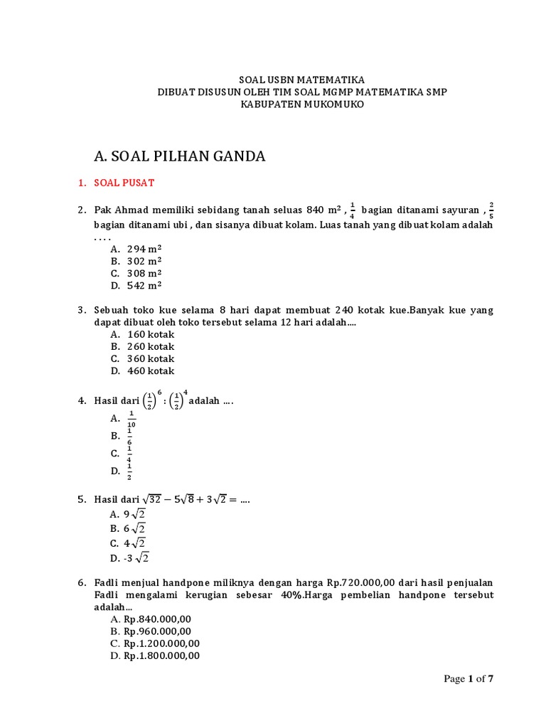 Soal Usbn Matematika Smp Kabupaten Mukomuko