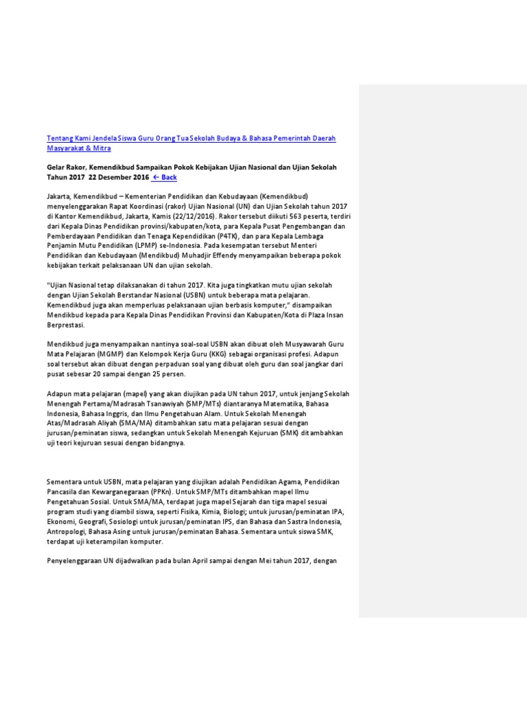 Penilaian pendidikan dalam rangka meningkatkan pelayanan terhadap guru atau praktisi pendidikan dalam hal penulisan soal telah dibuat pedoman penulisan soal yang terbagi menjadi pedoman penulisan soal sdmi pedoman penulisan soal smpmts pedoman penulisan soal smama dan smkmak. Soal un dibuat oleh kementerian pendidikan dan kebudayaan kemendikbud berdasarkan kisi kisi yang dikeluarkan oleh badan standar nasional pendidikan bsnp. Para guru tersebut tergabung dalam musyawarah guru mata pelajaran mgmp dan juga kelompok kerja guru kkg.