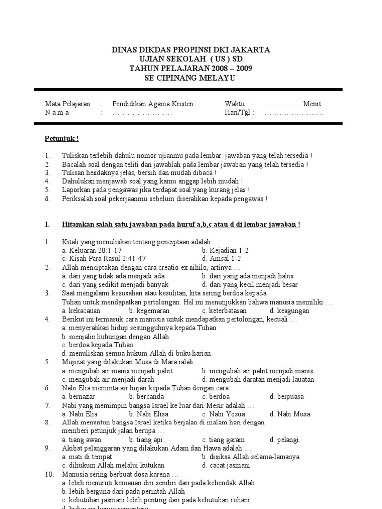 Soal Pendidikan Agama Kristen Kelas 1 Sd Semester 2