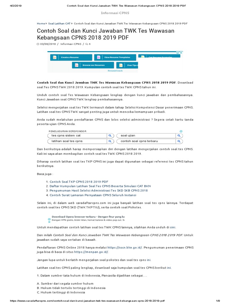 Contoh Soal Tes Cpns 2018 2019 Twk Lengkap Kunci Jawaban Pdf