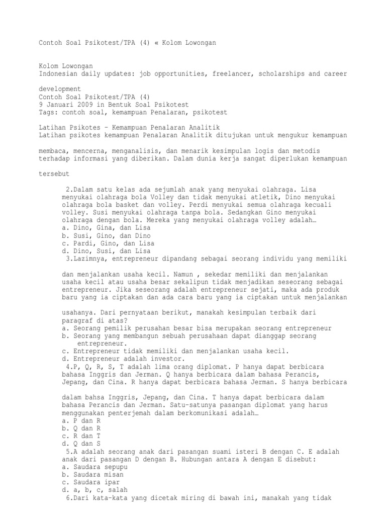 Contoh Soal Psikotest Tpa 4 Kolom Lowongan