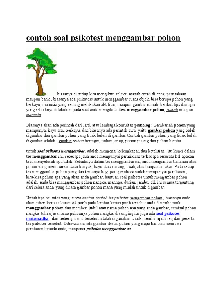 Contoh soal psikotes kemampuan verbal. Untuk lebih jelas berikut ini contoh soal psikotes gambar rumah pohon dan orang. Contoh psikotes gambar pohon yang baik dan benar yang akan saya bahas sudah lengkap dengan penjelasan dan cara menggambarnyasalah satu bentuk yang paling umum adalah pohon mangga atau yang berkambiumtetapi ada point penting dalam pembuatanyajadi silahkan fahami dengan baik penjelasan dalam artikel kali ini.