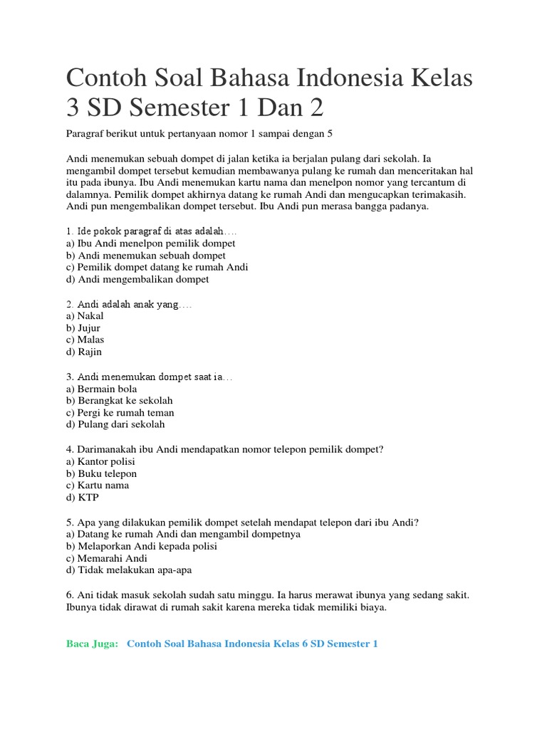 Contoh Soal Bahasa Indonesia Kelas 3 Sd Semester 1 Dan 2