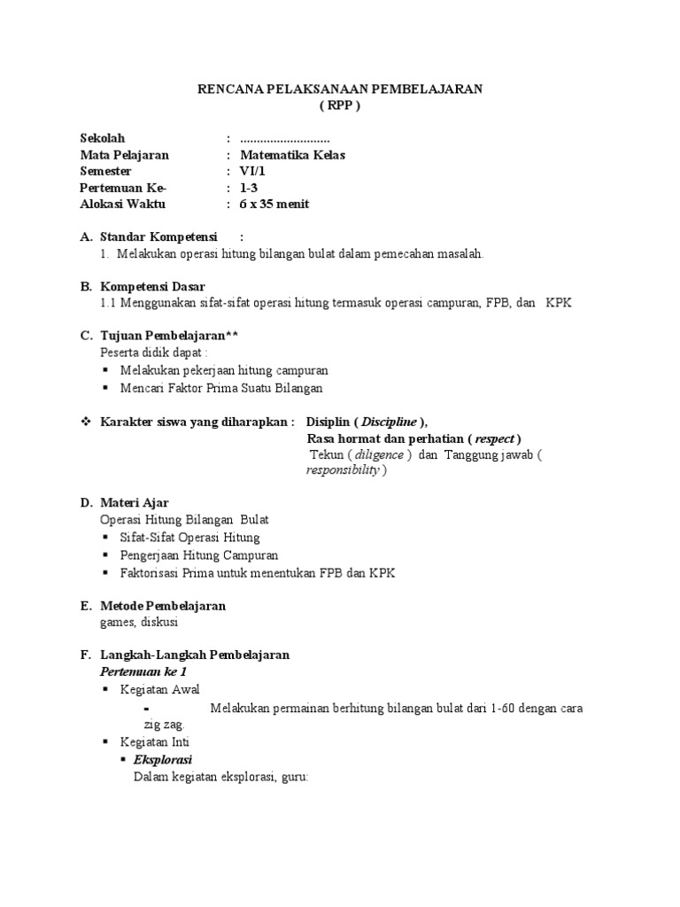 Rpp Matematika Kelas 6 Semester 1 Pertemuan 1 4 Docx